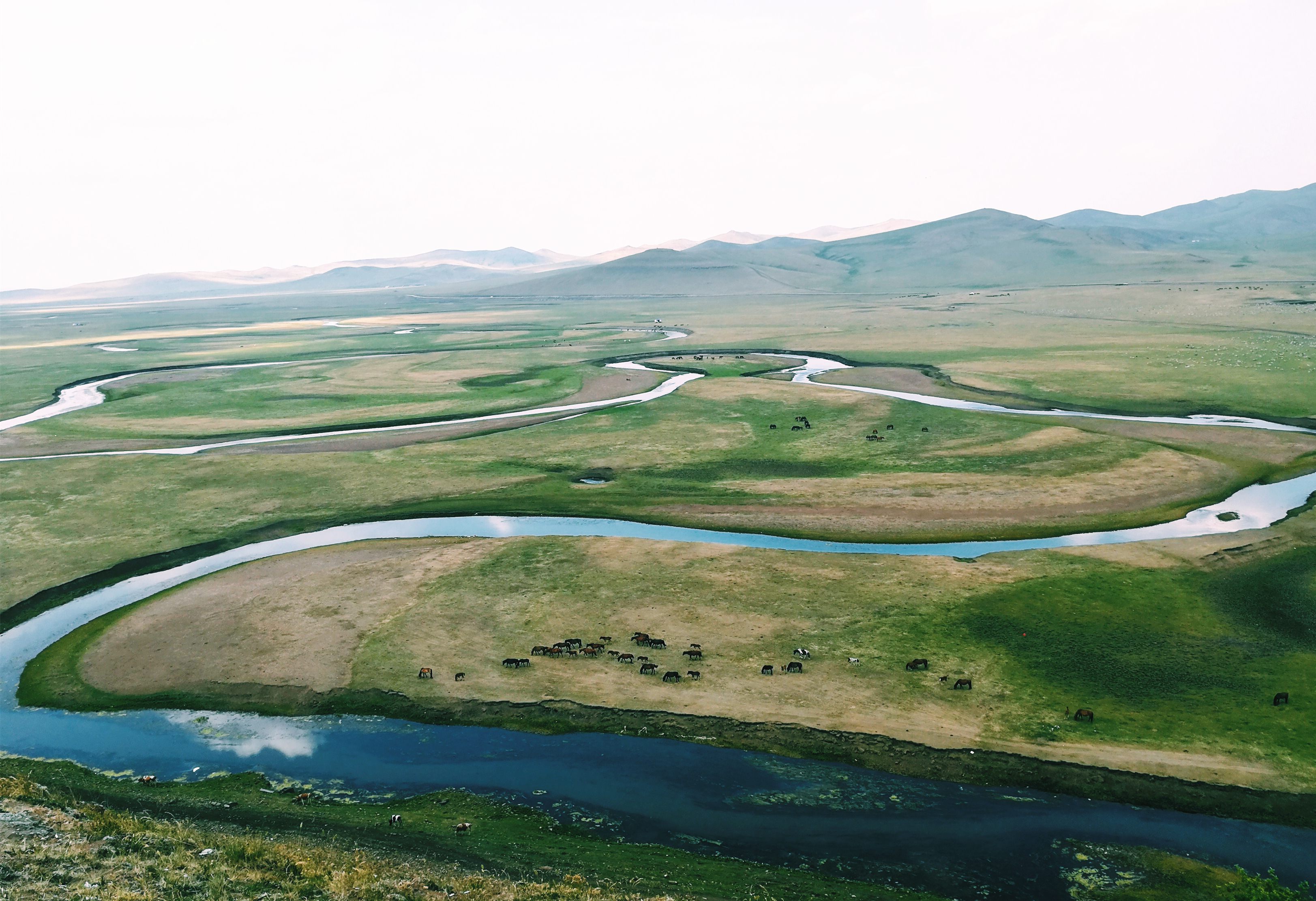 次日,欣賞著沿途的風景,我們驅(qū)車來到了老舍筆下的“天下第一曲水”——莫日格勒河。對于見慣大江大河的江南人來說,這里的河更像是渠,河道狹窄,彎彎曲曲,潔凈的河水歡快地流淌在草原之上,滋潤著河邊的綠植。因為今年是旱季,草原沒有想象中的翠綠,但絲毫沒有影響大草原的遼闊和壯美。大家盡情地在草原上撒歡,像是一個個大孩子,充分享受著粗狂式的自由和灑脫。