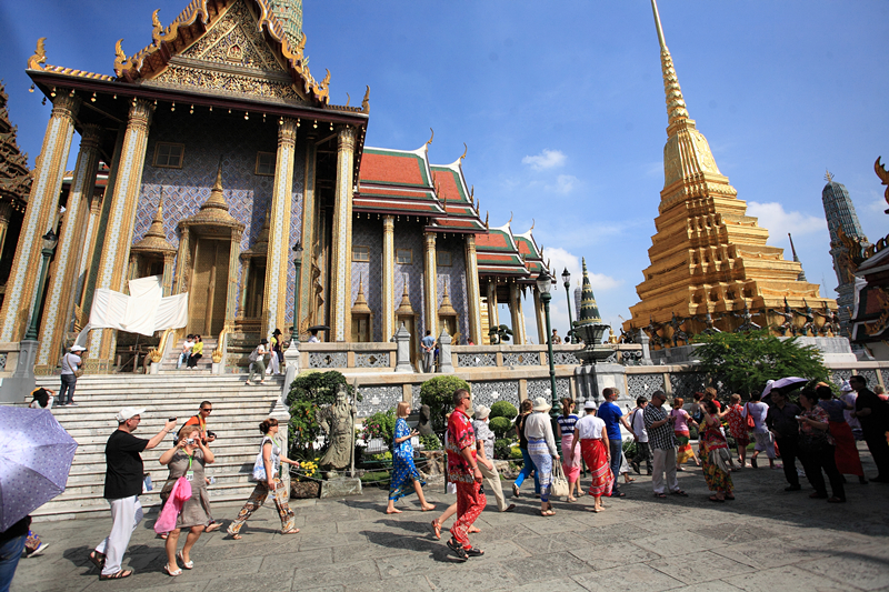 來到曼谷就不得不去大皇宮,這里是曼谷王朝拉瑪一世到拉瑪八世居住的地方,這里匯聚了泰國建筑、繪畫、雕刻和裝潢藝術(shù)的精粹,其風(fēng)格具有鮮明的暹羅建筑藝術(shù)特點(diǎn),被譽(yù)為“泰國藝術(shù)大全”。在大皇宮北邊的位置上就是玉佛寺,泰國人民最崇敬的玉佛就供奉在佛寺大雄寶殿金色的高座上。玉佛由整塊翡翠雕琢而成,高66公分,依照雨季、涼季、熱季更換錦衣。更換錦衣儀式都由國王親自主持。大皇宮和玉佛寺合稱為曼谷的標(biāo)志,人們無不為眼前氣勢如虹、金光燦燦的建筑所震撼,其西式的建筑風(fēng)格融合了泰國特色,仿佛在訴說著成長軌跡,是對歷史的記錄和對文化的傳承。